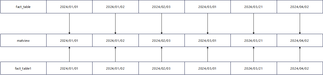 - 多基表对齐分区,多个基表的分区条件完全一致时,都会自动和物化视图进行映射。