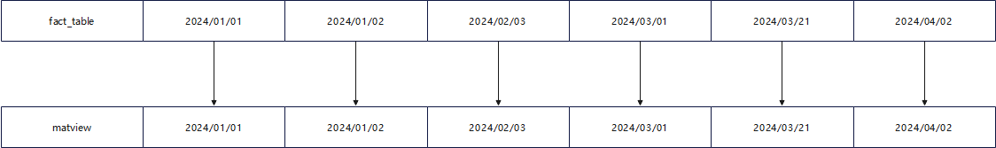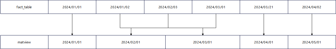 - 时间粒度上卷对齐分区,例如:基表按天分区,物化视图按月分区。