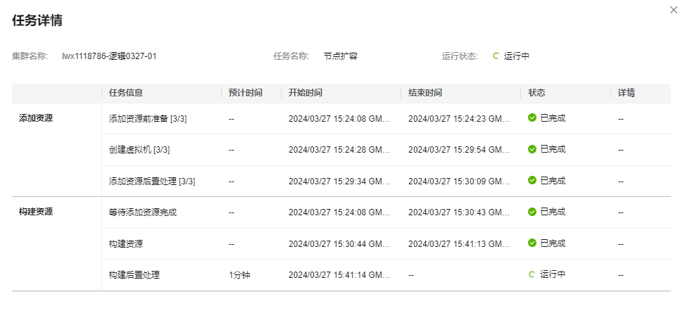 - 进入“扩容详情”页面,用户可查看集群此时的扩容状态。