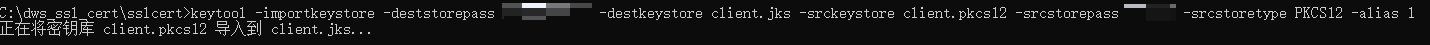 keytool -importkeystore -deststorepass Gauss@MppDB -destkeystore client.jks -srckeystore client.pkcs12 -srcstorepass password -srcstoretype PKCS12 -alias 1