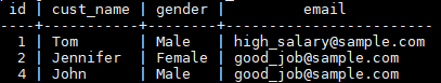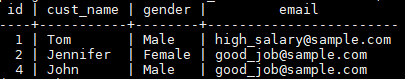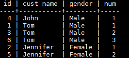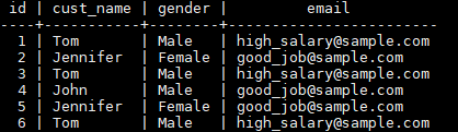CREATE TABLE t_customer ( id int NOT NULL, cust_name varchar(32) NOT NULL COMMENT '名字', gender varchar(10) NOT NULL COMMENT '性别', email varchar(32) NOT NULL COMMENT 'email', PRIMARY KEY (id) ) ; INSERT INTO t_customer VALUES ('1', 'Tom', 'Male', 'high_salary@sample.com'); INSERT INTO t_customer VALUES ('2', 'Jennifer', 'Female', 'good_job@sample.com'); INSERT INTO t_customer VALUES ('3', 'Tom', 'Male', 'high_salary@sample.com'); INSERT INTO t_customer VALUES ('4', 'John', 'Male', 'good_job@sample.com'); INSERT INTO t_customer VALUES ('5', 'Jennifer', 'Female', 'good_job@sample.com'); INSERT INTO t_customer VALUES ('6', 'Tom', 'Male', 'high_salary@sample.com');