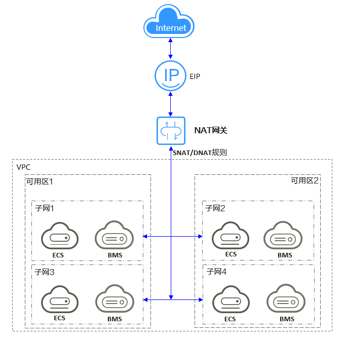 NAT网关通过与EIP绑定,可以使多个云主机(弹性云服务器、裸金属服务器等)共享EIP访问公网或使云主机提供互联网服务。