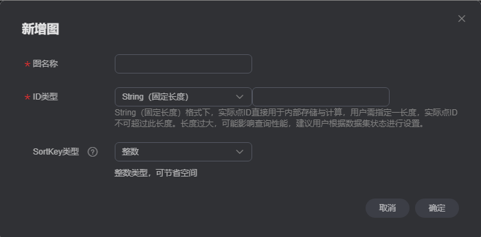 - 在页面左上角,单击“新增图”按钮,在弹出的新增图窗口中填写图名称、选择点ID类型和SortKey类型。