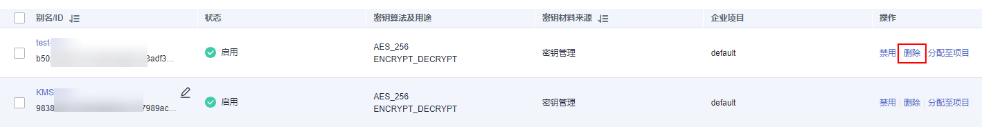 - 待删除的密钥需处于“启用”、“禁用”或者“等待导入”状态。