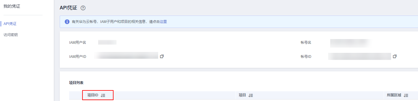 - 在“API凭证”页面的项目列表中查看项目ID。