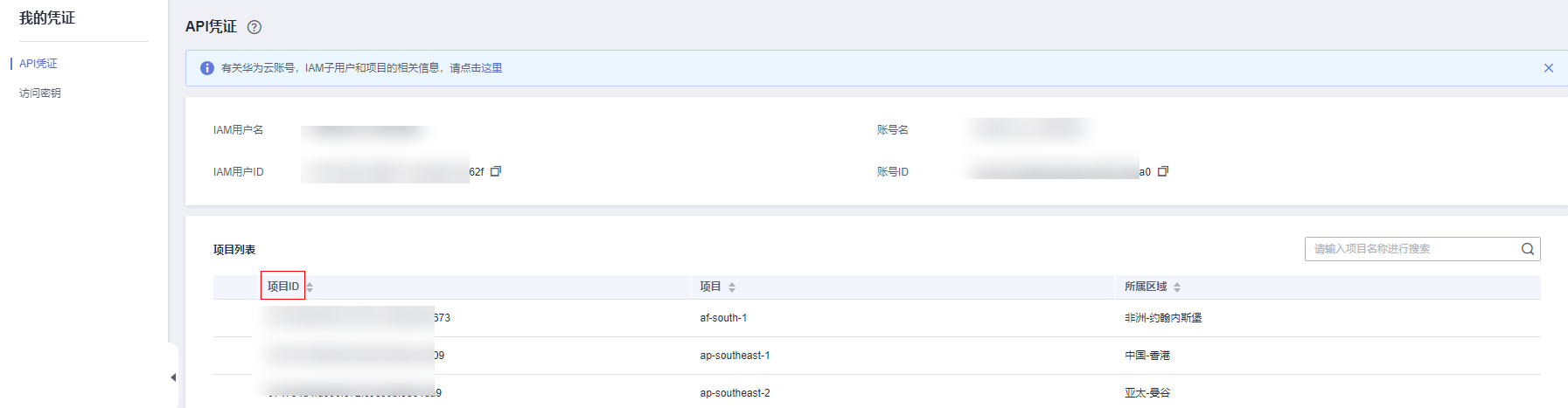 - 在“我的凭证”页面,获取项目ID(project_id),以及账号名、账号ID、IAM用户名和IAM用户ID。