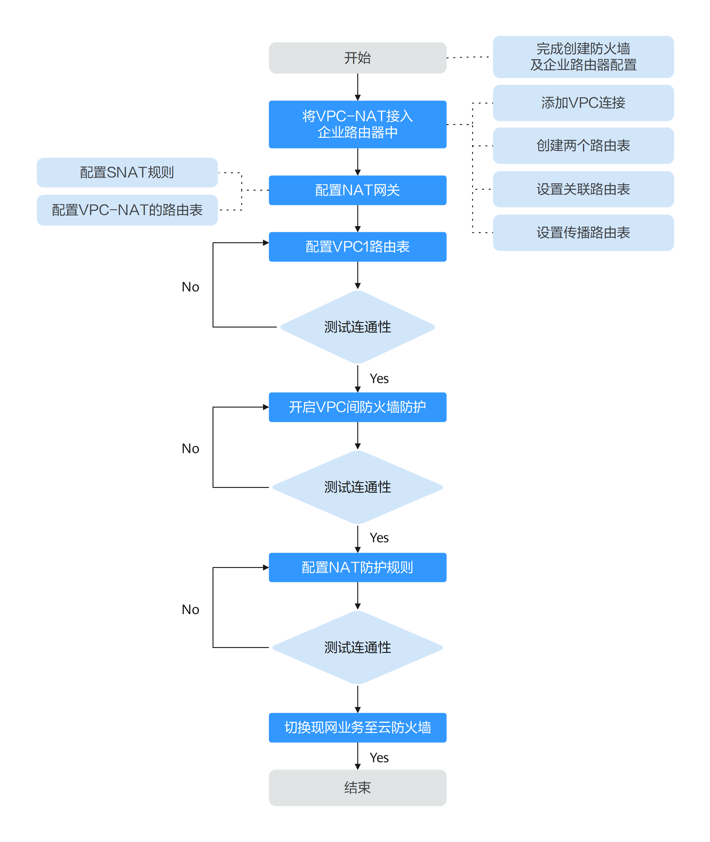 - 在前期网络规划复杂甚至不合理的情况下(例如存在VPC网段重叠、NAT网关已有复杂配置、已通过VPC-Peering配置东西向通信等场景下),请充分评估网络互连、环路、路由冲突等风险。