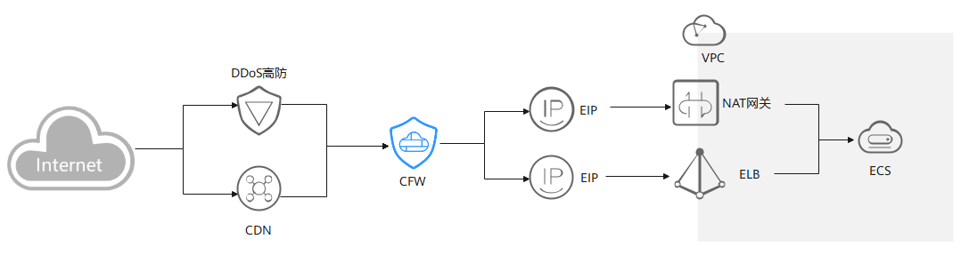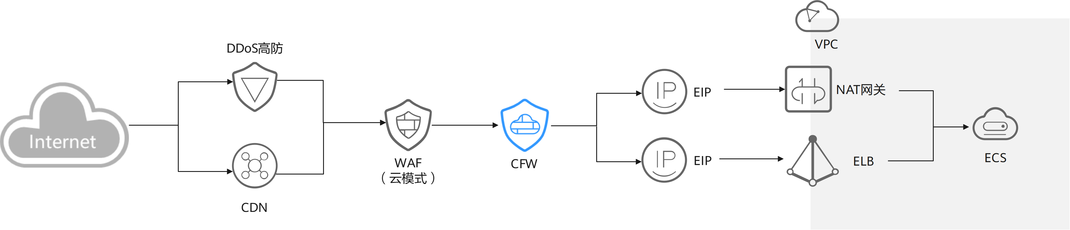 Web应用防火墙(WAF)、DDoS高防(Advanced Anti-DDoS)、内容分发网络(CDN)会对用户的流量进行反向代理,部署后,CFW接收到的源IP为上述服务的回源IP。