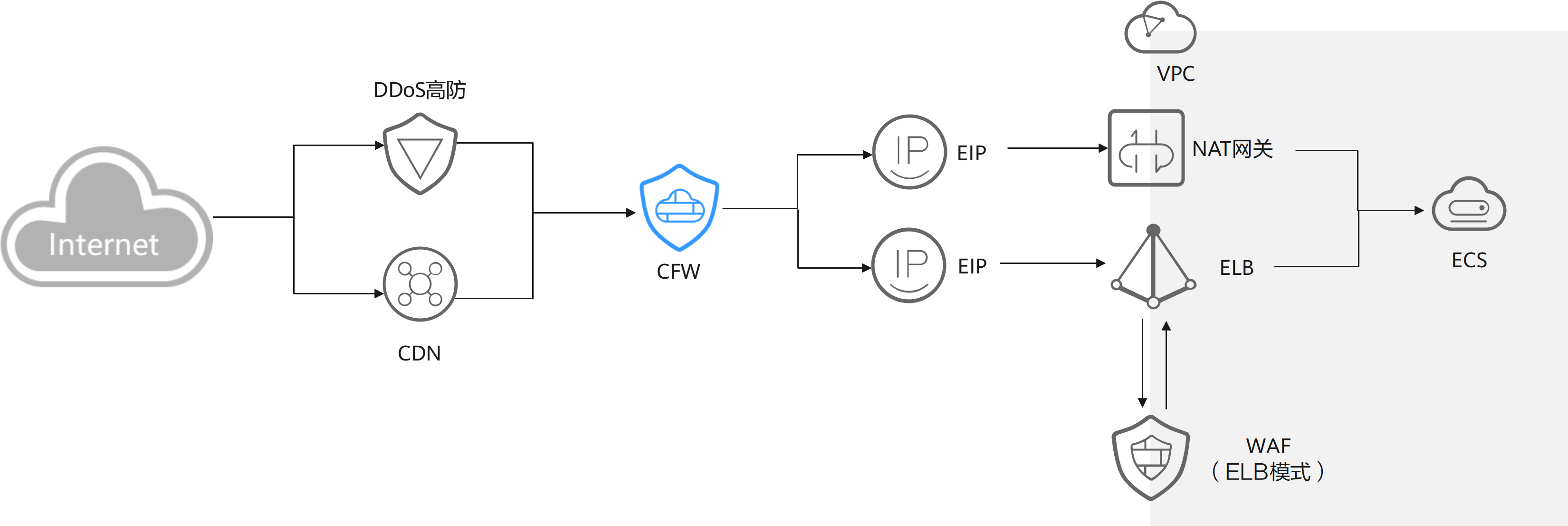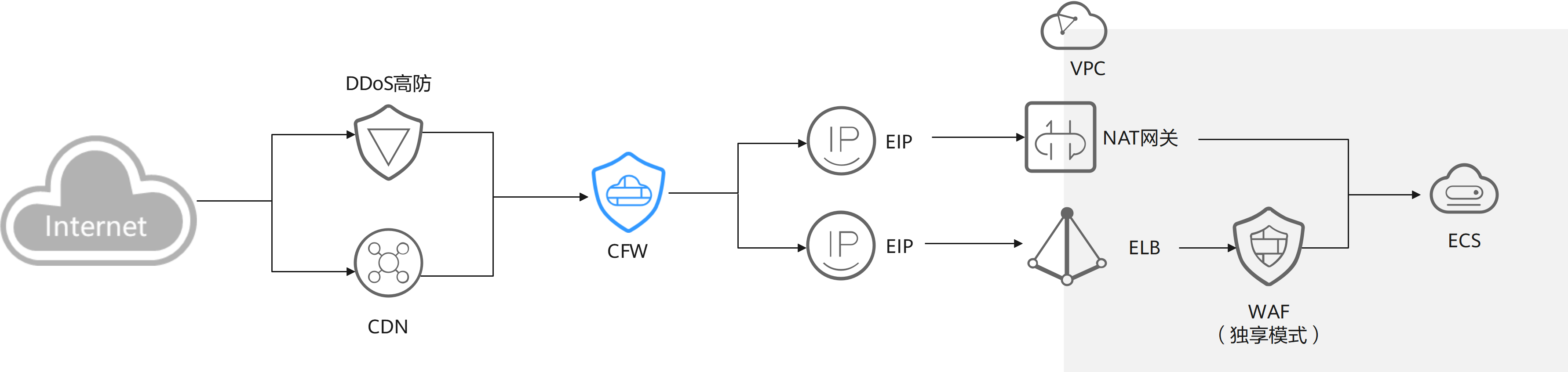 当配置了华为云的其他产品后,业务流量会经过多道防护,在对入云流量进行防护时,如果CFW前存在反向代理服务(即购买了CDN、DDoS高防或云模式WAF),需配置放行回源IP策略,避免误拦截,购买独享模式WAF或ELB模式WAF时,按业务需要配置即可。