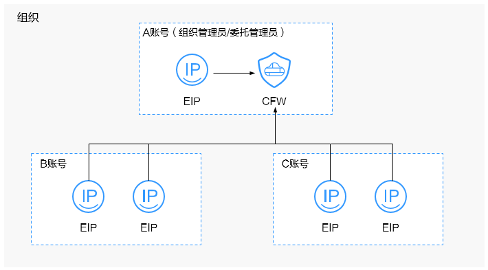 跨账号防护EIP资源的方案为:A账号是组织管理员或委托管理员,将B账号、C账号添加到组织成员,A账号中购买云防火墙,在防火墙中将B账号、C账号添加到组织成员,开启对应EIP的防护及配置防护策略。