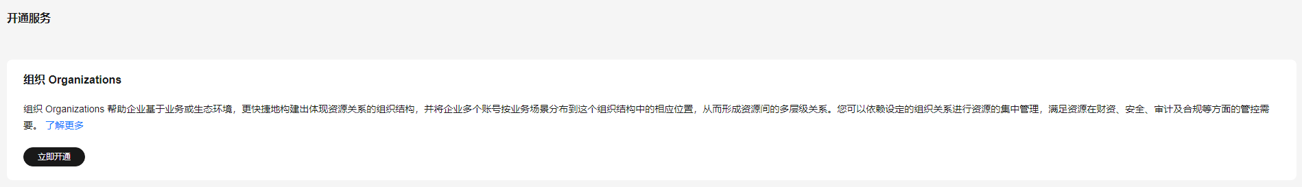 - 开通Organizations云服务。进入开通页,单击“立即开通”。