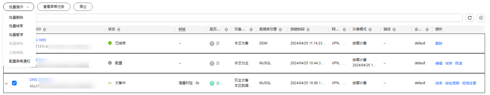 - 选择“批量操作 > 主备倒换”,将灾备实例由只读状态更改为读写状态。