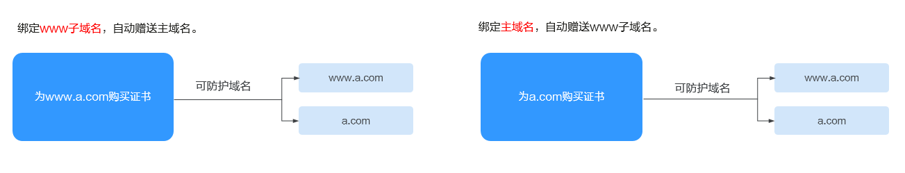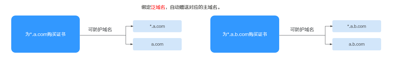 - 如果泛域名证书的主域名为一级域名,云证书与管理服务默认赠送主域名。例如:您购买的泛域名证书为*.huaweicloud.com其包含了huaweicloud.com,为您默认赠送huaweicloud.com域名,无需再购买证书绑定huaweicloud.com。