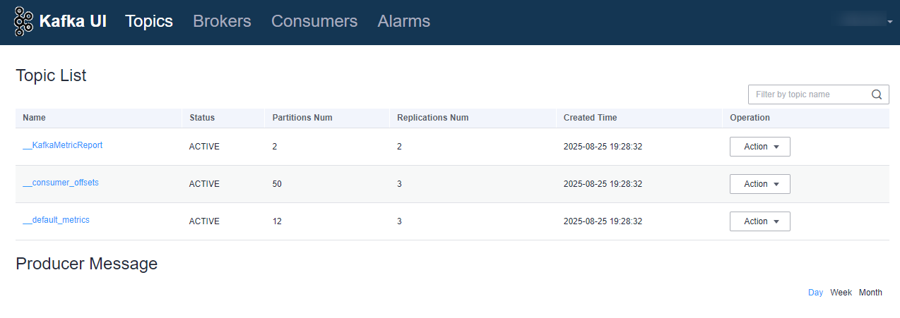 在“Producer Message”栏可根据业务需求选择“Day”、“Week”、“Month”不同时段查看此Topic生产数据条数。