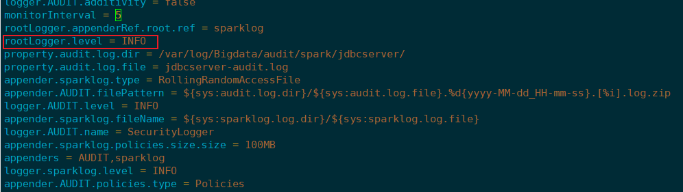 - 登录Spark客户端节点,修改“{客户端安装目录}Spark/spark/conf/log4j2.properties”配置文件,修改参数“rootLogger.level”值为“INFO”,如下所示:
