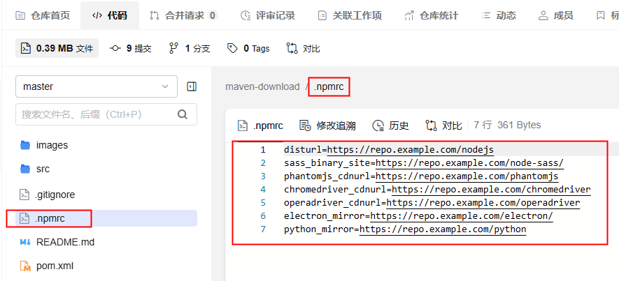 在代码仓根目录下创建.npmrc文件,并在文件中配置镜像源信息。本示例以CodeArts Repo代码仓为例。