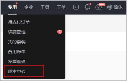 2. 进入控制台,单击“费用”的下拉框,选择“成本中心”。