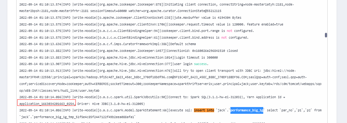 打开日志,搜索insert into,找到如下的日志,根据日志中打印的Yarn ApplicationId到MRS Resource Manager上看Yarn任务详情。