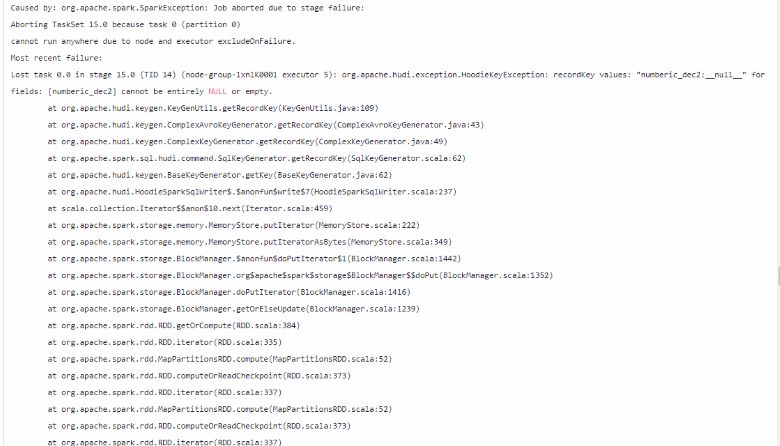 查看作业配置,查看表属性中hoodie.datasource.write.recordkey.field、hoodie.datasource.write.precombine.field、hoodie.datasource.write.partitionpath.field配置的列在源端数据中是否存在空值。