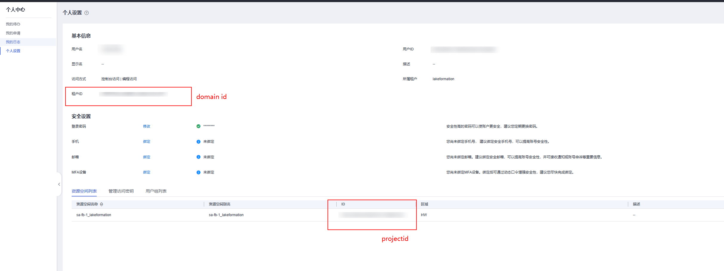 - 在属性配置中,新增lakeformation.authentication.iam.apig.proxy.endpoint和 lakeformation.authentication.project.id配置项,lakeformation.authentication.iam.apig.proxy.endpoint配置项值获取方法参考步骤2配置, lakeformation.authentication.project.id参考下图在个人中心获取。