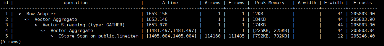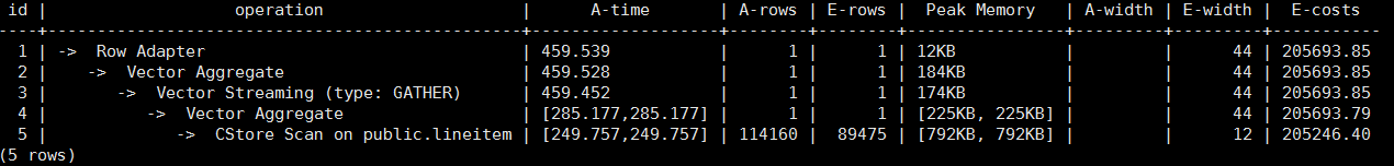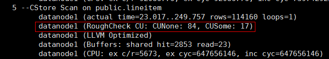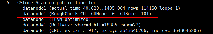 使用partial cluster key后,5-- CStore Scan on public.lineitem的时间减少了1.2s,得益于有84个CU被过滤掉了。