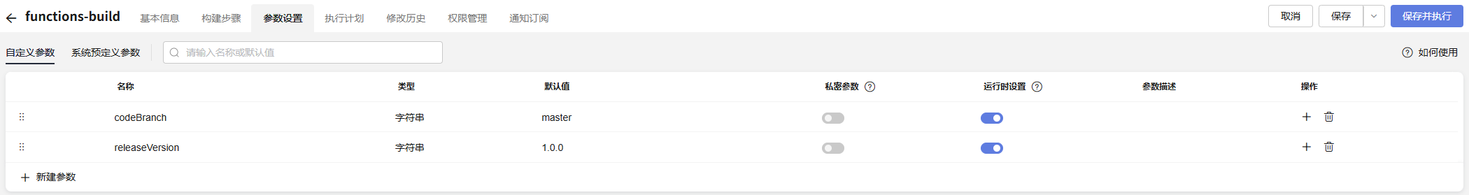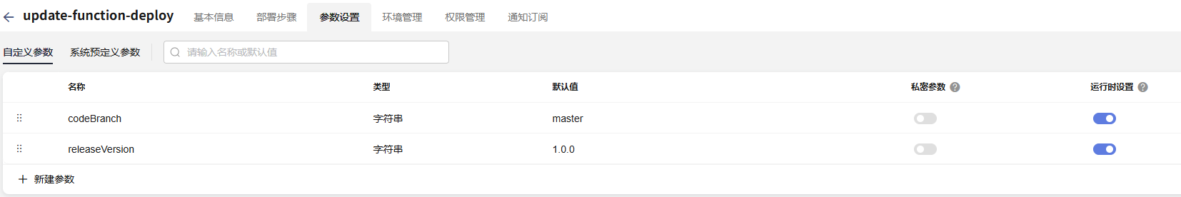- 选择“参数设置”页签,在“自定义参数”中新增“codeBranch”和“releaseVersion”参数,开启“运行时设置”。