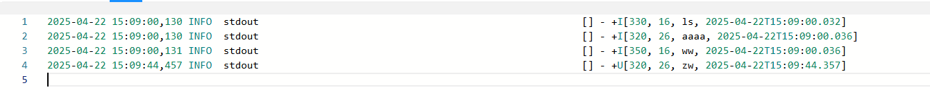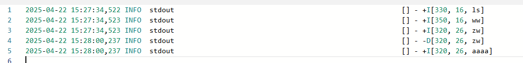 - 查看更新后的输出结果,打印数据只有+U而没有-U。经过多次尝试,发现都没有-U数据,怀疑是SinkUpsertMaterializer将-U数据拦截了。