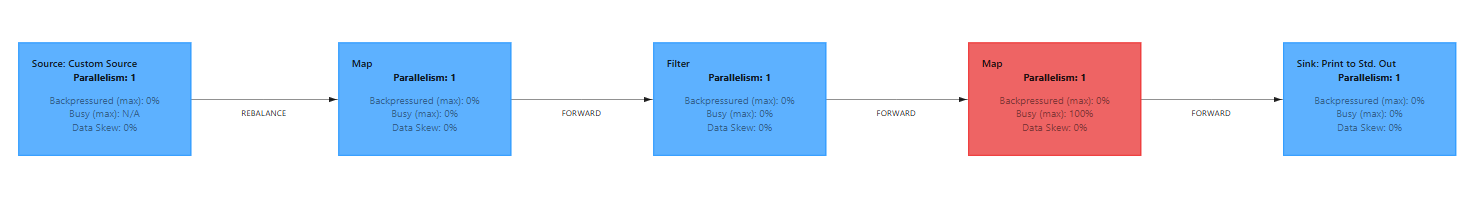 通过pipeline.operator-chaining=false将算子链打散,就能看到是map算子有问题,从而进一步确认问题原因。