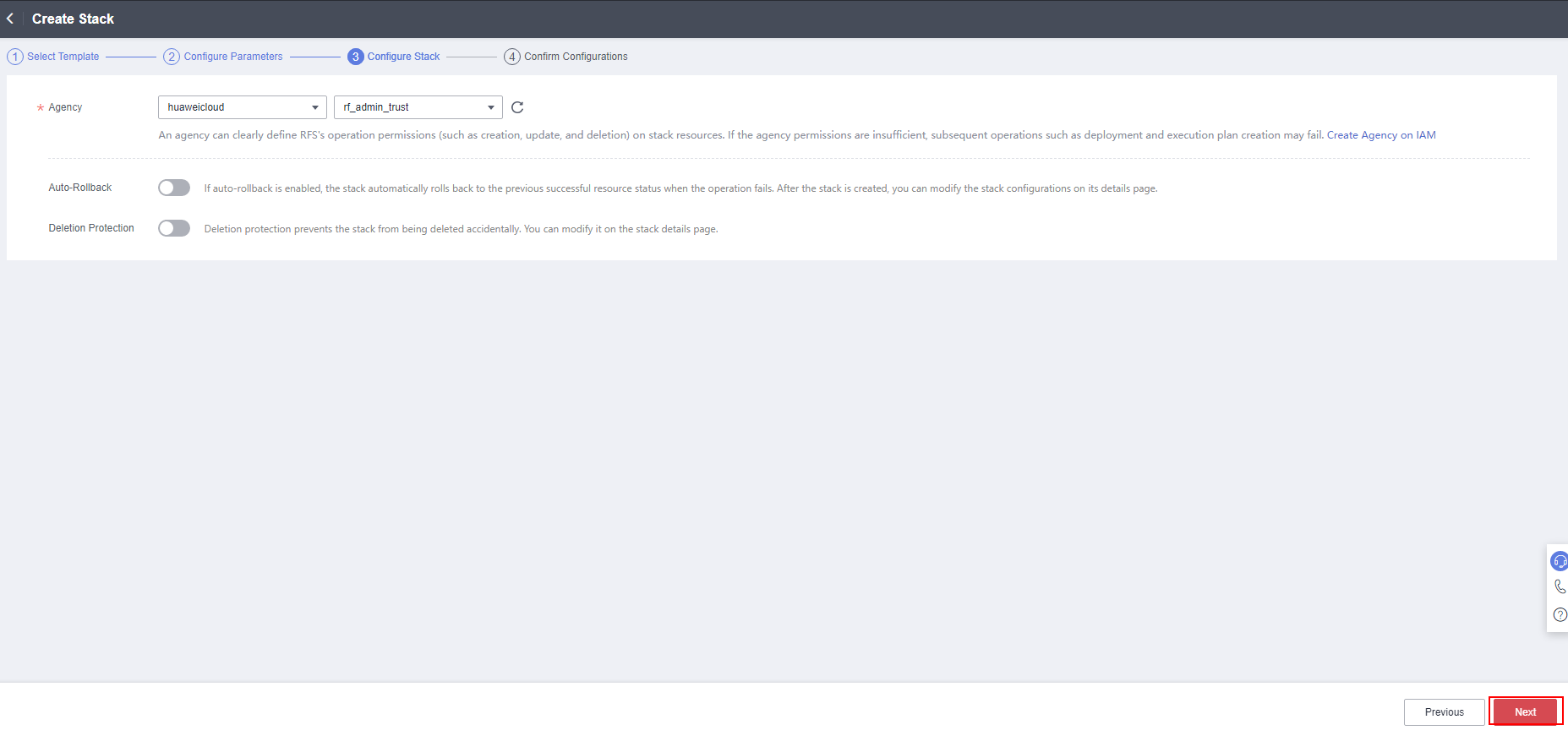 - 在资源栈设置页面中,权限委托选择“rf_admin_trust”,单击“下一步”。