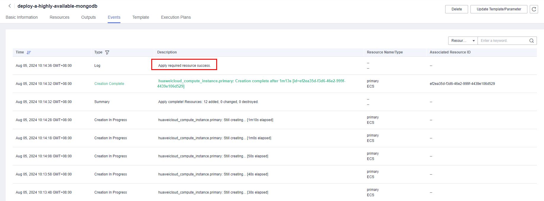 - 等待解决方案自动部署。部署成功后,单击“事件”,回显结果如下: