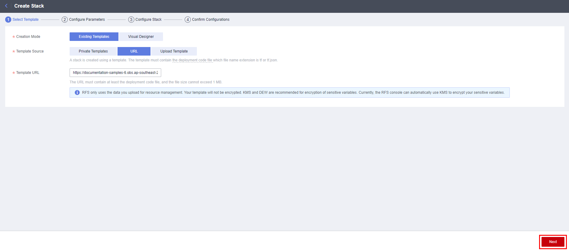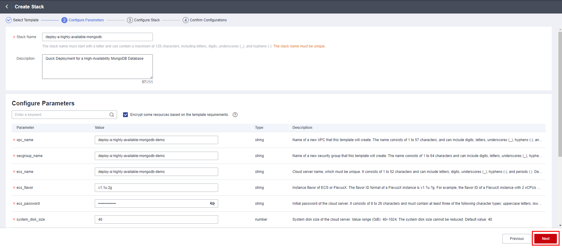 - 在配置参数界面中,参考表1完成自定义参数填写,单击“下一步”。
