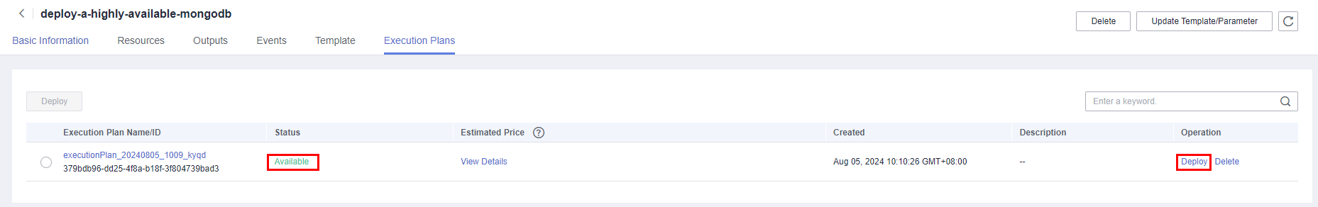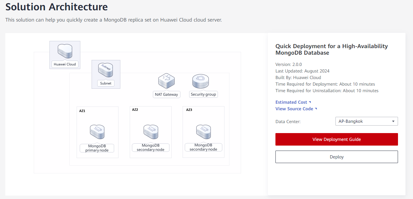 - 登录华为云解决方案实践,选择“快速部署高可用MongoDB”解决方案。单击“一键部署”,跳转至解决方案创建堆栈界面。