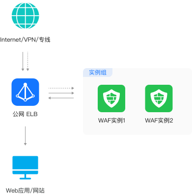 流量通过ELB先发送给WAF检测,再发送给后端。弹性:可在同一实例组中购买多个实例,提升实例组整体性能。更好的故障恢复能力:当WAF发生故障时,流量将直接通过ELB发送给后端,不影响客户正常业务。 仅支持云上Web业务