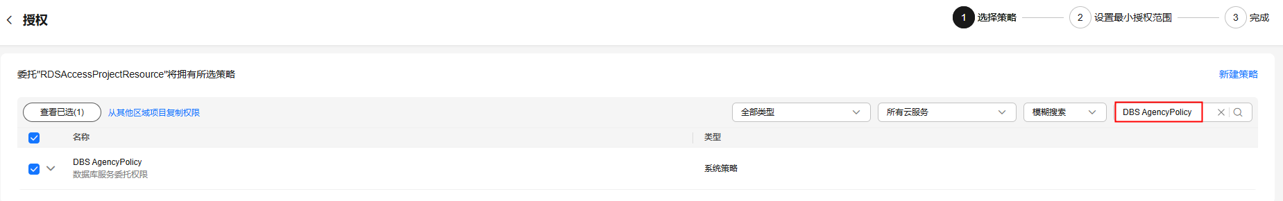 6. 搜索勾选DBS AgencyPolicy权限,单击“下一步”。