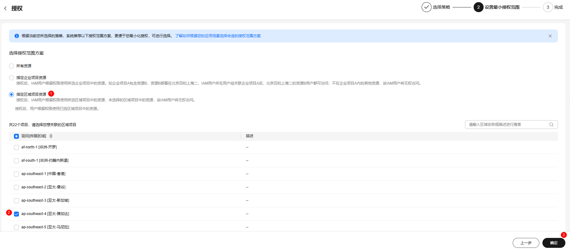 7. 选择指定区域项目资源,勾选要授权的Region,单击“确定”。