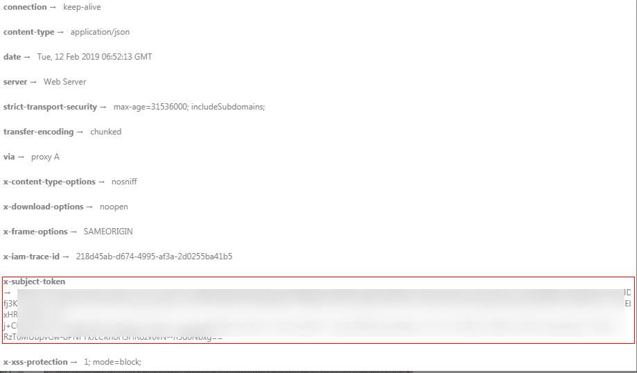 对于获取用户Token接口,返回如图1所示的消息头,其中“X-Subject-Token”就是需要获取的用户Token。有了Token之后,您就可以使用Token认证调用其他API。