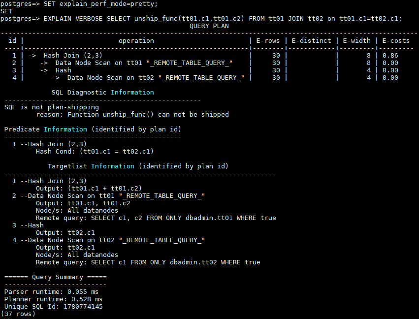 SET enable_stream_operator=off; SET explain_perf_mode=normal; EXPLAIN (VERBOSE on,COSTS off) SELECT * FROM tt01,tt02 WHERE tt01.c1=tt02.c1; QUERY PLAN ----------------------------------------------------------------------------- Hash Join Output: tt01.c1, tt01.c2, tt02.c1, tt02.c2 Hash Cond: (tt01.c1 = tt02.c1) -> Data Node Scan on tt01 "_REMOTE_TABLE_QUERY_" Output: tt01.c1, tt01.c2 Node/s: All datanodes Remote query: SELECT c1, c2 FROM ONLY dbadmin.tt01 WHERE true -> Hash Output: tt02.c1, tt02.c2 -> Data Node Scan on tt02 "_REMOTE_TABLE_QUERY_" Output: tt02.c1, tt02.c2 Node/s: All datanodes Remote query: SELECT c1, c2 FROM ONLY dbadmin.tt02 WHERE true (13 rows) |