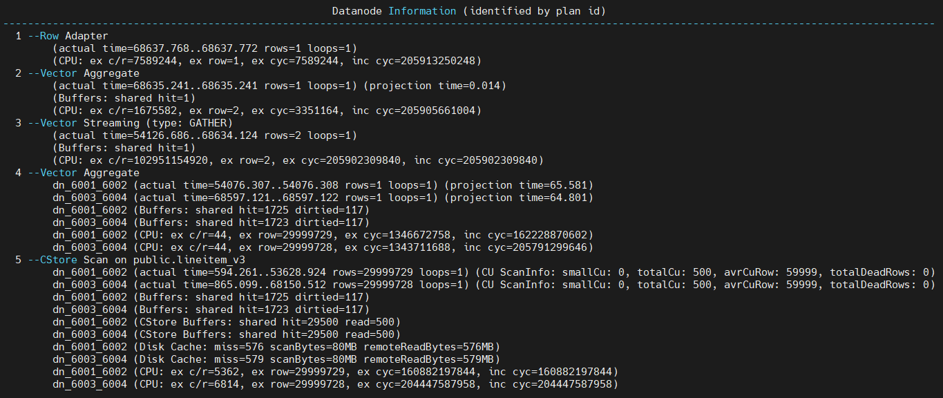 每个算子执行的过程都有CPU信息,其中cyc代表的是CPU的周期数,ex cyc表示的是当前算子的周期数,不包含其子节点;inc cyc是包含子节点的周期数;ex row是当前算子输出的数据行数;ex c/r则是ex cyc/ex row得到的每条数据所用的平均周期数。