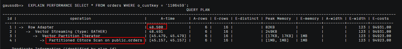 EXPLAIN PERFORMANCE SELECT * FROM orders WHERE o_custkey = '1106459'; |