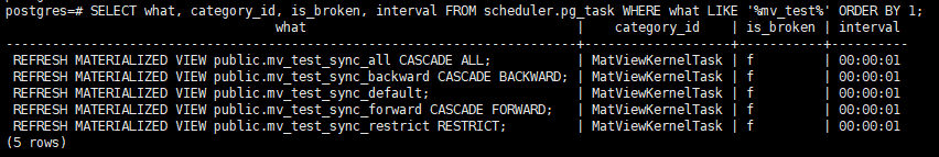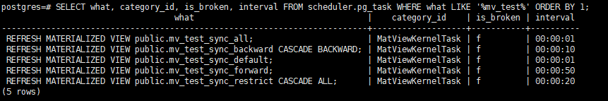 SELECT what, category_id, is_broken, interval FROM scheduler.pg_task WHERE what LIKE '%mv_test%' ORDER BY 1;