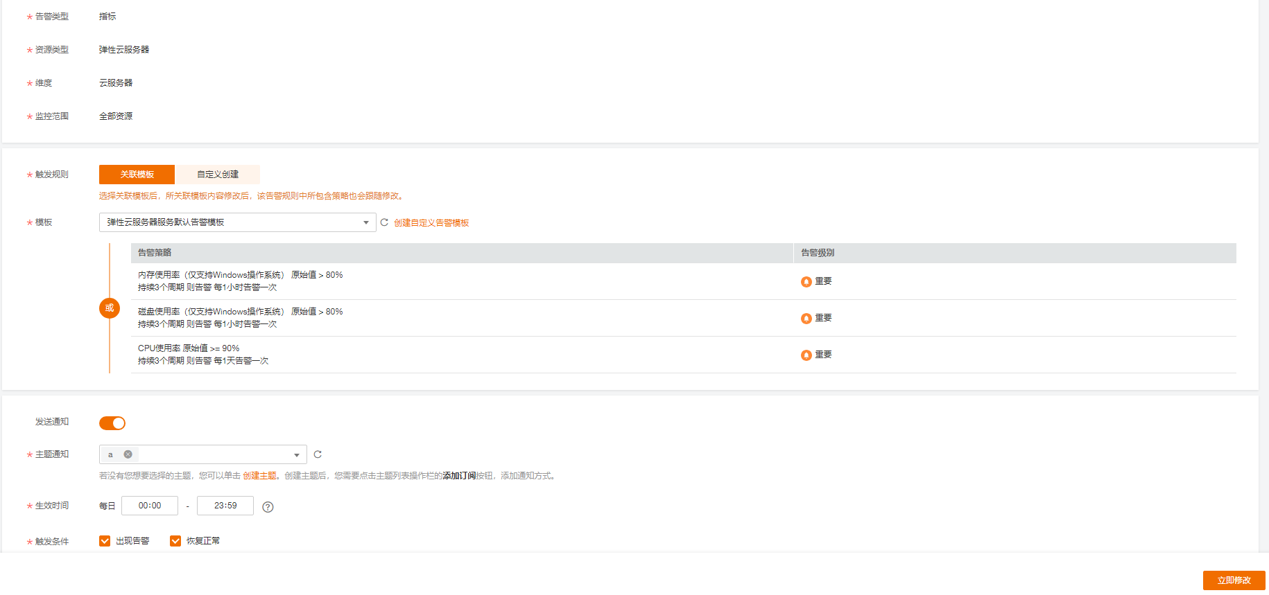 说明:如果界面显示有关联模板,选择该模板后,且所关联模板内容修改后,该告警规则中所包含策略也会跟随修改。