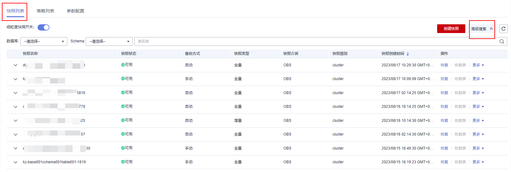 - 切换至“快照>快照列表”页签,开启细粒度快照开关。并单击右边“高级搜索”按钮。
