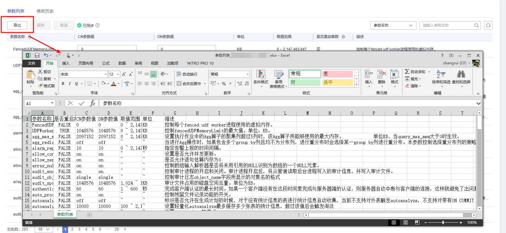 - 单击“参数修改”页签,并在页面顶部单击“导出”按钮。可导出集群相关配置参数。
