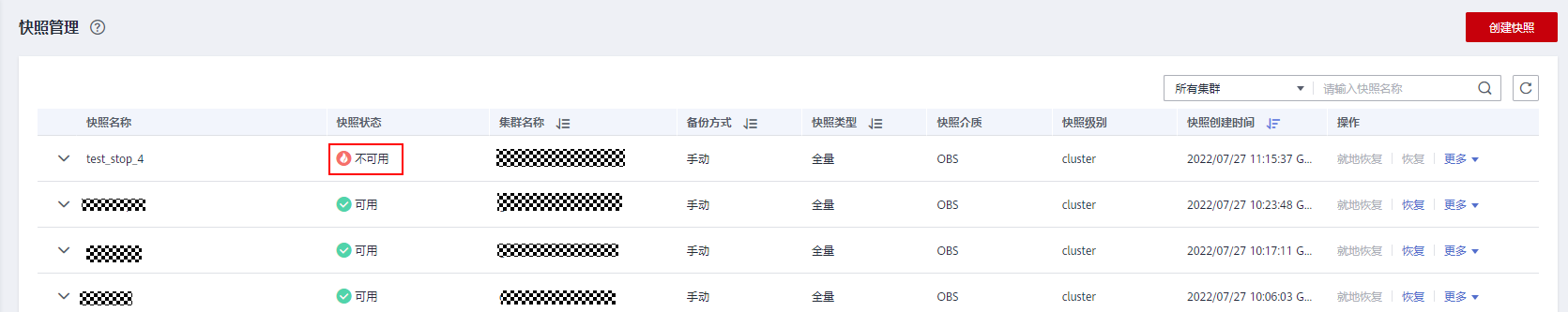 用户创建快照开始后,可以根据需求在“快照管理”页面手动停止本次快照。