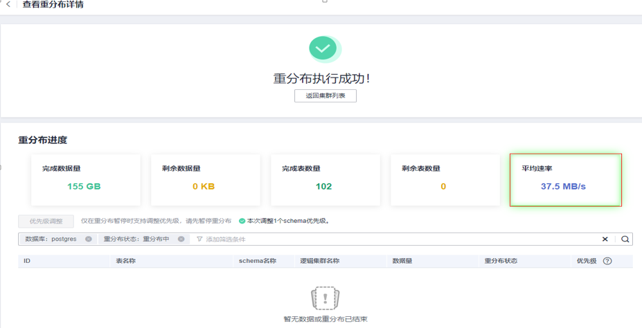 - 重分布完成后会显示重分布进度(完成数据量、剩余数据量、完成表数量、剩余表数量、重分布过程中的平均速率)。