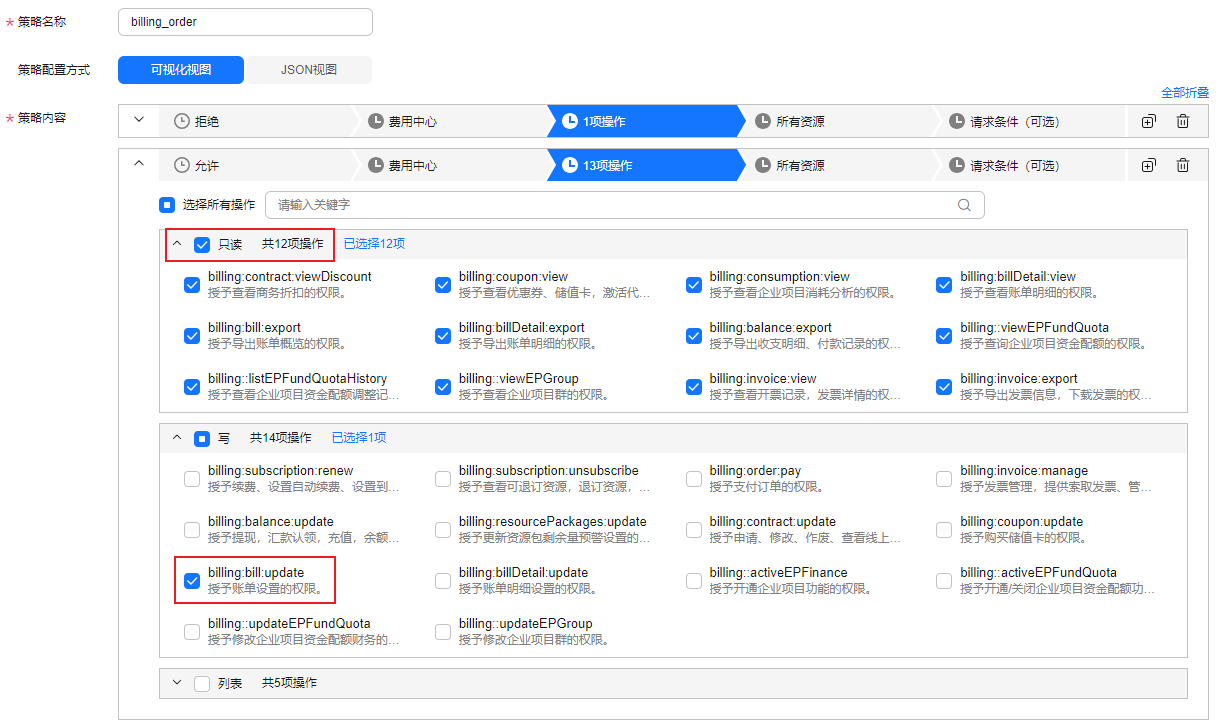 - 在“操作”下打开“写”操作,选择“billing:bill:update”授权项,并全选只读授权项。