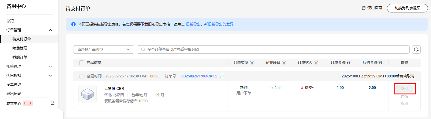 设置成功后,IAM用户A登录到华为云进入“费用中心>待支付订单”,将无法单击订单的操作列“支付”按钮。