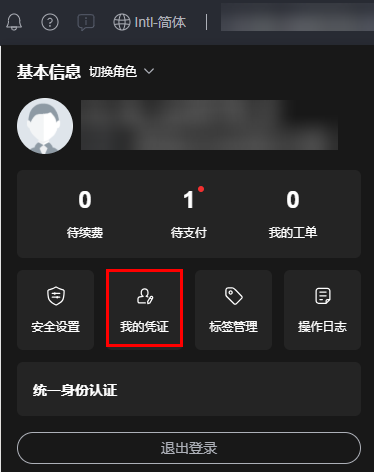 - 在“控制台”页面,鼠标移动至右上方的用户名,在下拉列表中选择“我的凭证”。