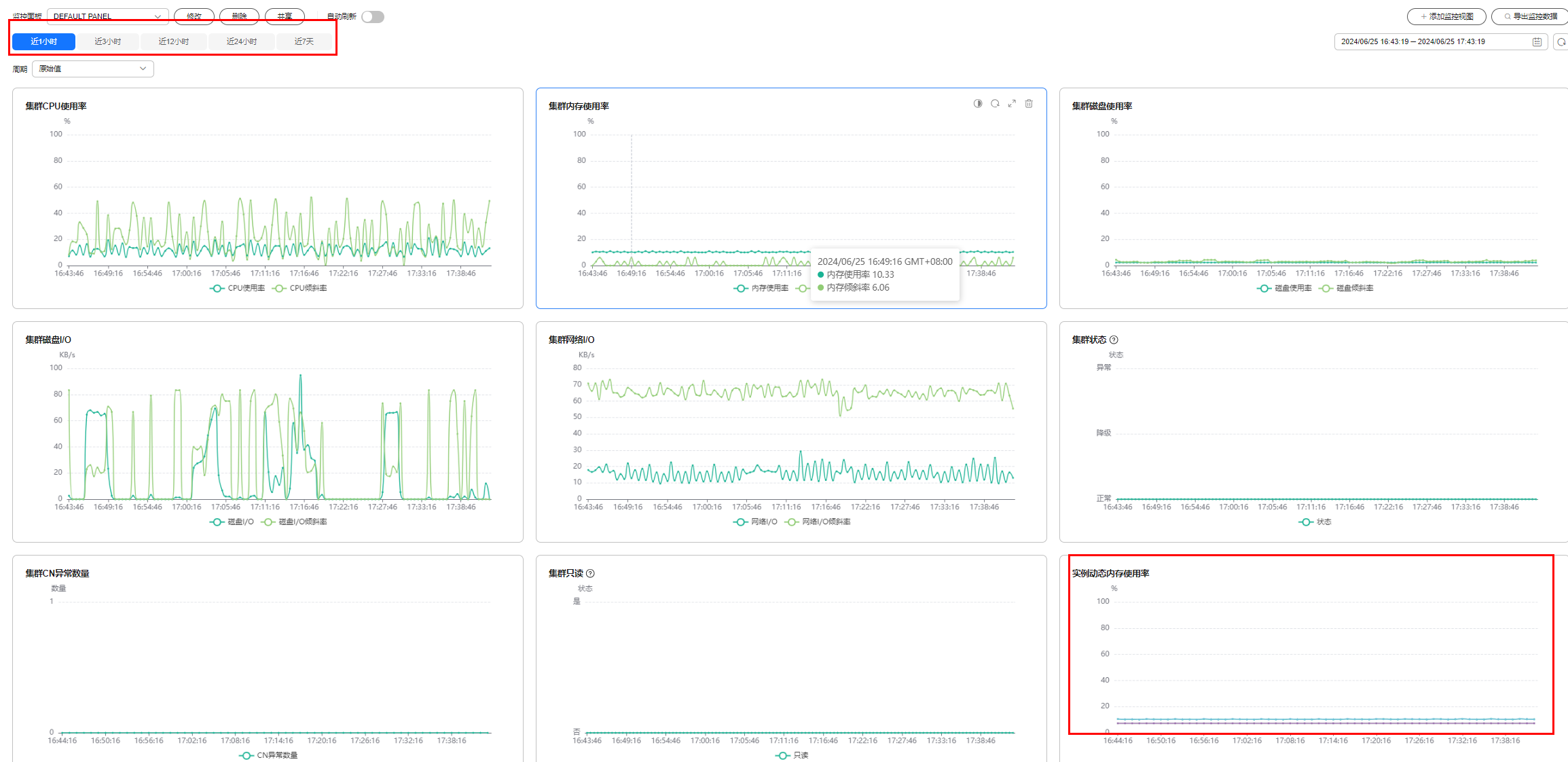 - 即可在下方视图中查看当前集群各实例的实例动态内存使用率的具体情况,左上角可选择查看最近1/3/12/24小时/7天的动态内存使用率,判断是否有实例动态内存使用率突然增大的情况。