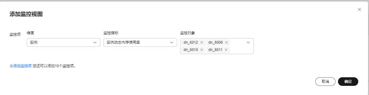 - 选择“监控 > 性能监控 > 添加监控视图”,选择实例、实例动态内存使用率、想要查看的实例名,确认无误后单击“确定”。